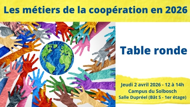 - [16/03/2022] Table ronde 2022 sur les métiers de la coopération au développement17 février 2022Savez-vous ce qu’est (exactement) la coopération au développement ? Quels sont les domaines professionnels concernés ? Faut-il privilégier certaines voies d’accès pour intégrer les métiers qu’ils recouvrent ? Votre (futur) diplôme et vos compétences vous permettent-ils d’envisager une carrière professionnelle de ce type ? Les réalités du terrain sont-elles faites pour vous ? Quelle influence la crise sanitaire a-t-elle eu sur les projets de coopération ?