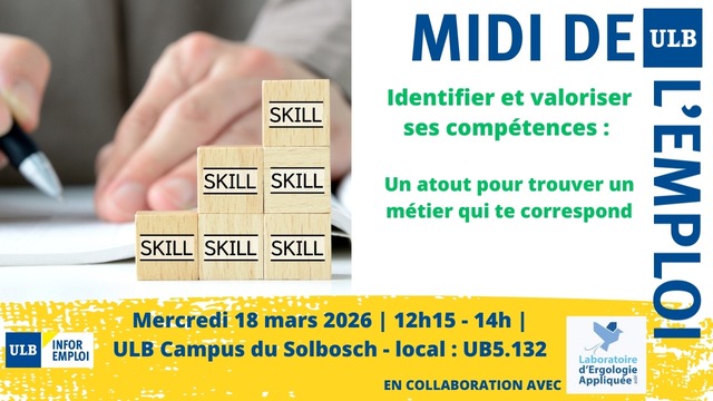 - A la carte : mini-cycle pour stratégie de recherche d'emploi réussie !16 décembre 2022Vous êtes encore aux études ou déjà diplômé.e de l’ULB ? Vous êtes en recherche d’emploi/de stage ou vous commencez à vous y intéresser ? Les midis de l'emploi sont l'occasion idéale pour vous préparer au mieux !
